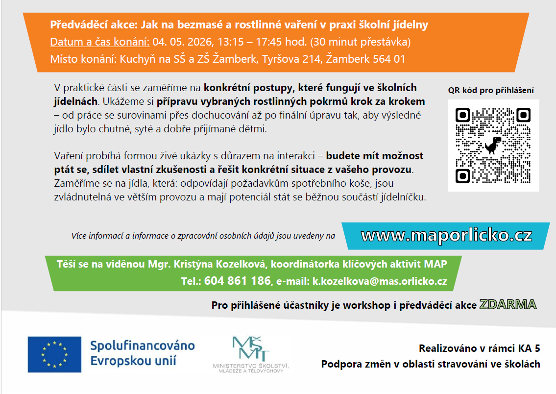 Předváděcí akce se uskuteční 4. 5. 2026 od 13:15 do 17:45 (30 min přestávka) také na Střední škole a základní škole Žamberk, Tyršova 214, Žamberk 564 01. V případě zájmu se prosím přihlaste zde nebo přes QR kód, který naleznete v pozvánce.