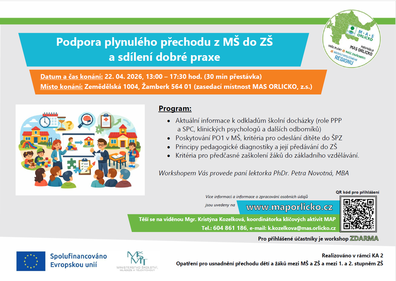 Zveme Vás na workshop pro MŠ „Podpora plynulého přechodu z MŠ do ZŠ a sdílení dobré praxe“, který se uskuteční 22. 4. 2026 od 13:00 do 17:30 (30 min přestávka) v zasedací místnosti MAS ORLICKO, z.s., Zemědělská 1004, Žamberk 564 01. Workshop je pro účastníky ZDARMA. V příloze naleznete pozvánku.Workshopem Vás provede PhDr. Petra Novotná, MBA.V případě zájmu se prosím přihlaste přes tento odkaz: https://forms.gle/dJpq8VwNwMEKtJPr6.