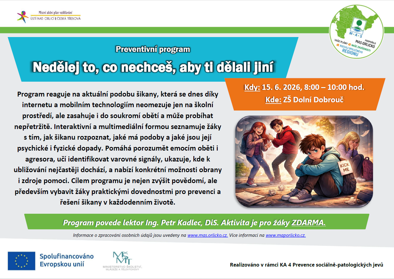 15.6.2026 proběhne preventivní program "Nedělej to,co nechceš, aby ti dělali jiní" na ZŠ Dolní Dobrouč