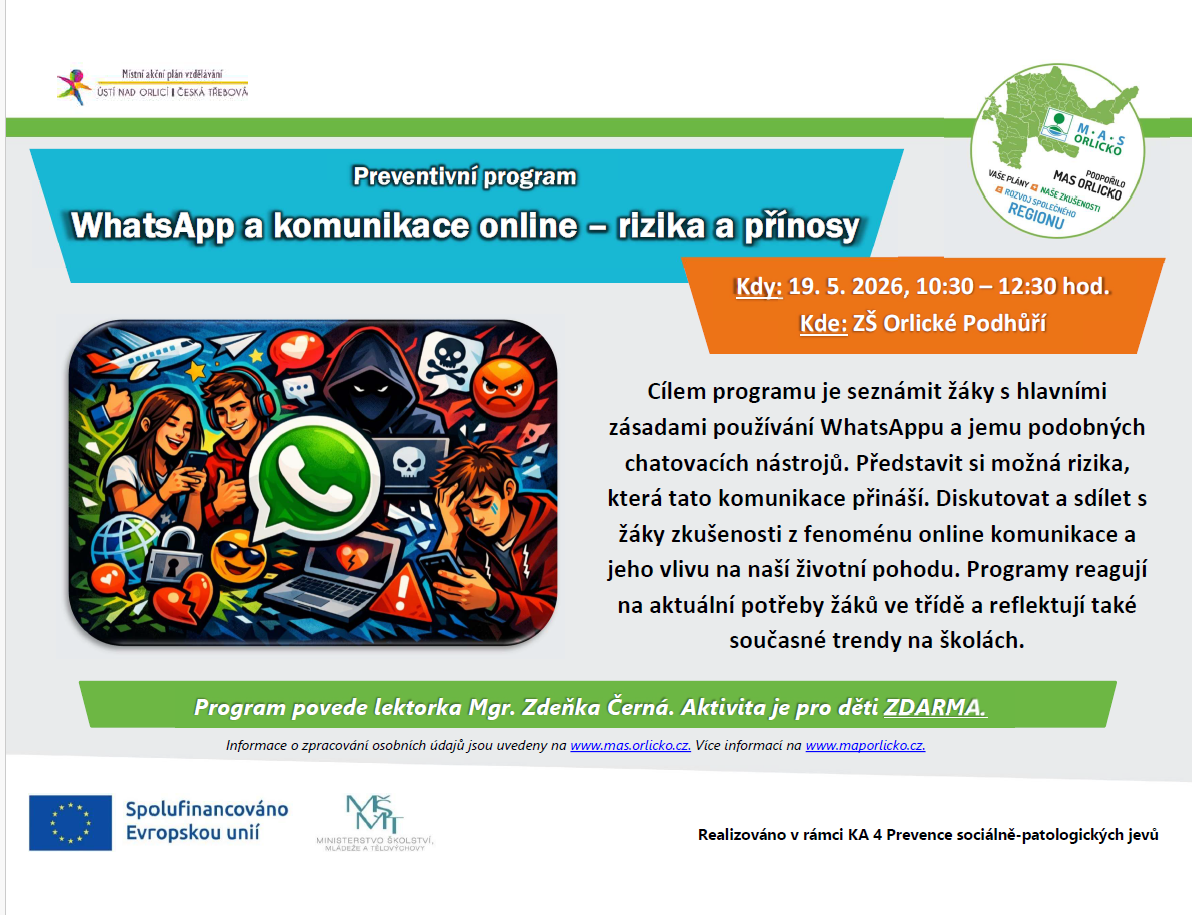 19.5.2026 proběhne preventivní program "WhatsApp a komunikace online - rizika a přínosy" na ZŠ Orlické Podhůří.