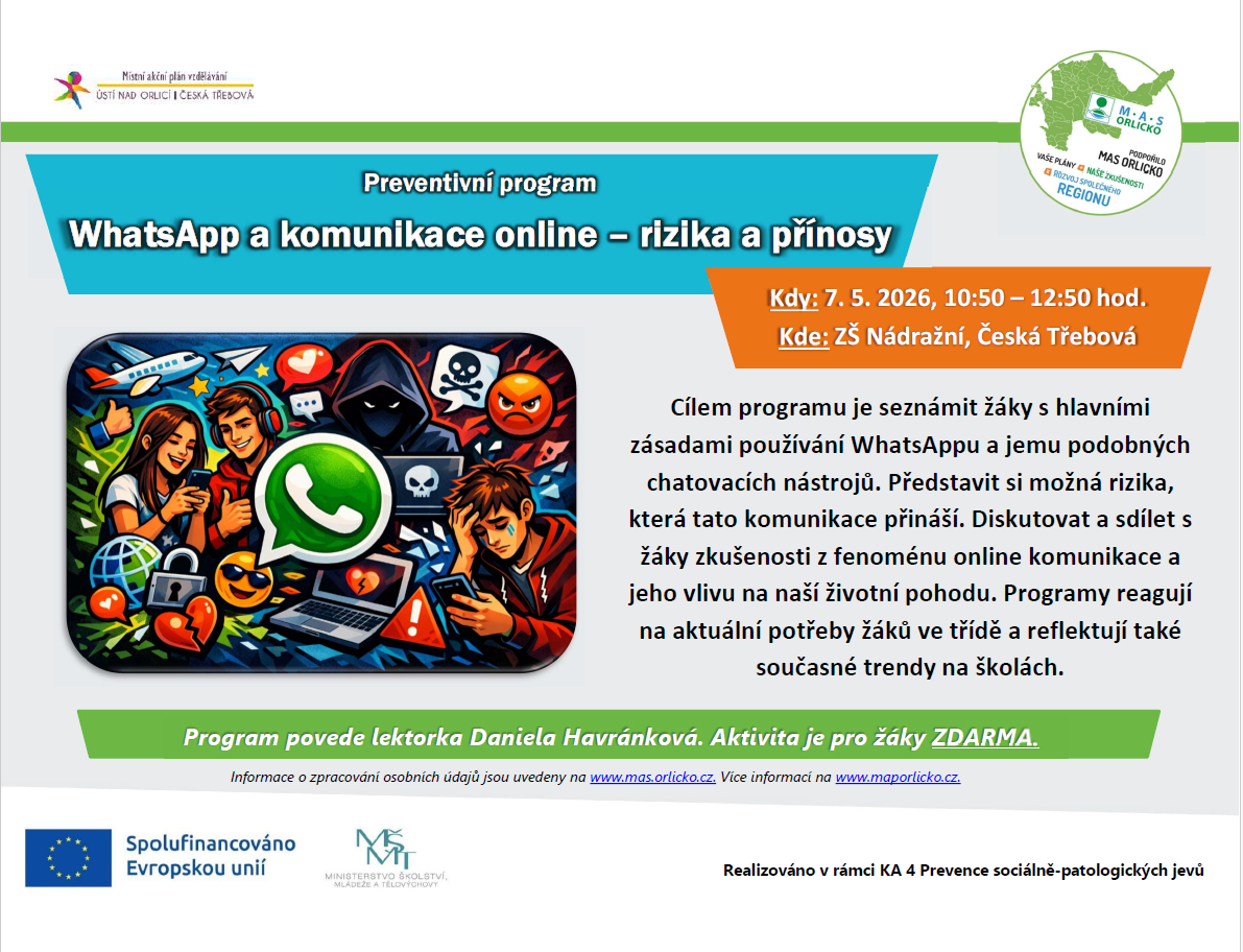 7.5.2026 proběhne preventivní program "WhatsApp a komunikace online – rizika a přínosy" na ZŠ Nádražní v České Třebové