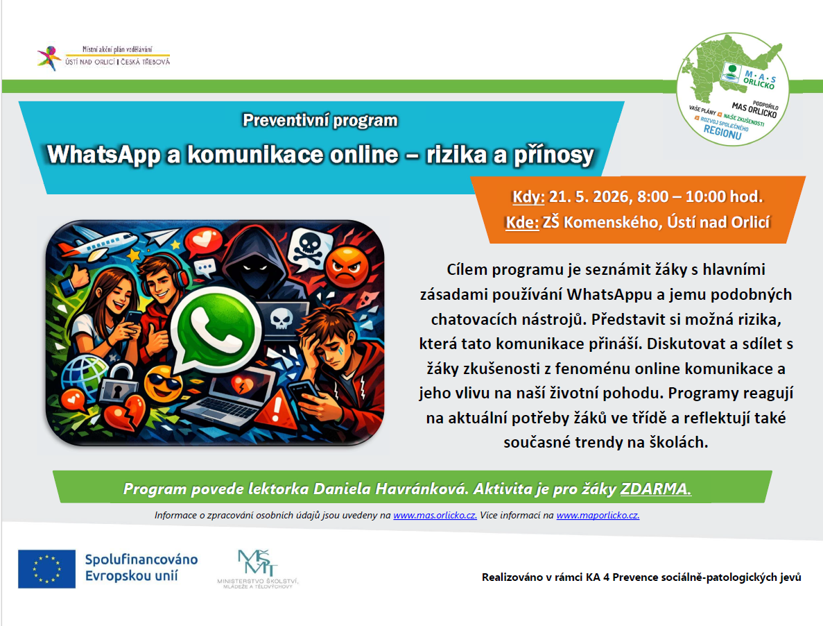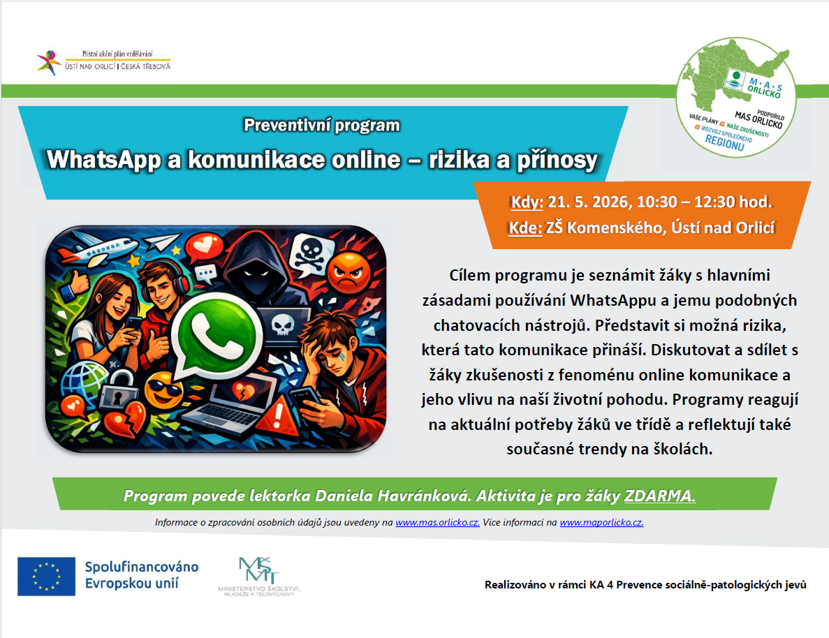 21.5.2026 proběhne preventivní program "WhatsApp a komunikace online – rizika a přínosy" na ZŠ Komenského v Ústí nad Orlicí