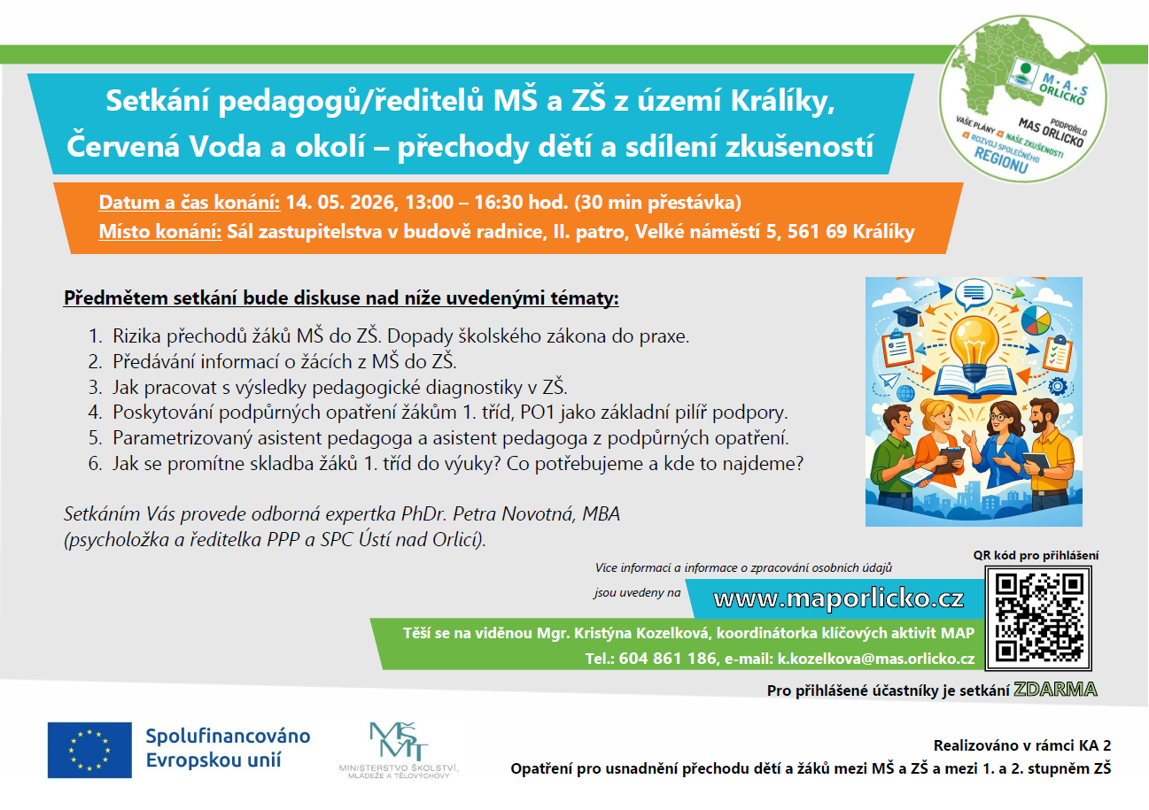 Dovolte nám Vás a Vaše pedagogy pozvat na setkání pedagogů/ředitelů MŠ a ZŠ z území Králíky, Červená Voda a okolí, které bude zaměřeno na sdílení zkušeností a informací ohledně přechodů dětí z MŠ do ZŠ. Setkání se uskuteční 14. 5. 2026 od 13:00 do 16:30 hodin (30 min přestávka) v sálu zastupitelstva v budově radnice, II. patro, Velké náměstí 5, 561 69 Králíky. Setkání je pro účastníky ZDARMA. V případě zájmu se prosím přihlaste zde nebo přes QR kód, v pozvánce.
