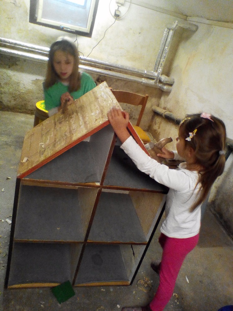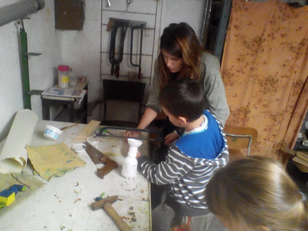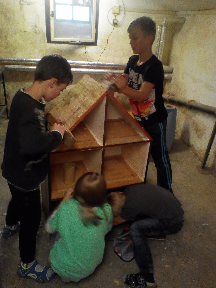 Cíl aktivity: žáci s pedagogem, rodiči a pracovníkem obce se jednou za 14 dnů scházeli v dílnách školy. Společně vyráběli různé výrobky ze dřeva, přírodnin a plastu. Nejprve vyrobili sedátka, která malovali a následně lakovali – ta nyní slouží pro všechny návštěvník školy jako odpočinkový prostor. Poté se zpracovávaly dýně a byla z nich uspořádána výstava strašidelných dýní ve sklepení školy. Během dalších pracovních odpolední se vyráběl domeček pro panenky a potřebný nábytek. Posledním zpracovávaným materiálem byl plast, kdy z PET lahví vzniklo několik soch a jiná umělecká díla.