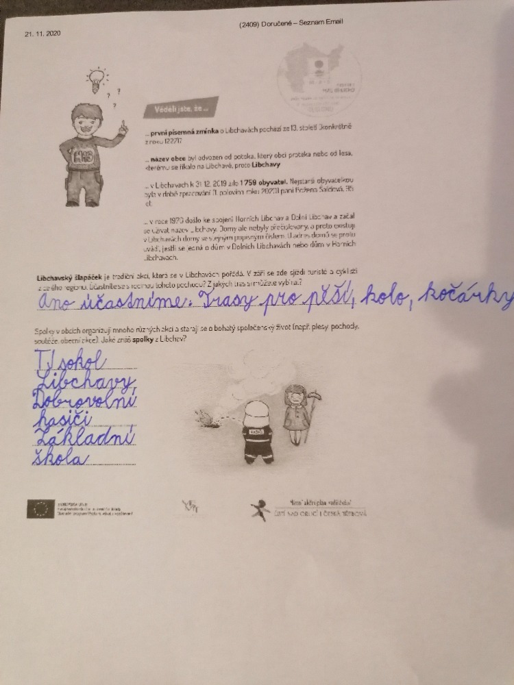 V lednu 2019 obdržely zapojené školy první zadání pro vypracování úkolu a nyní se k nám dostávají první výsledky. Jsme moc rádi, že děti tyto úkoly baví a že mohou zdokonalovat a rozšiřovat své znalosti o místě, kde žijí. Podívejte se například, jak si s jedním z úkolů poradili žáci z Libchav.