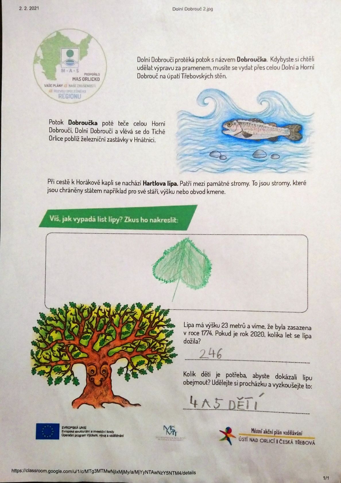 Na konci ledna 2021 nám zapojené základní školy předaly zpracovaný 4. úkol na téma Turistické cíle a zajímavosti. Musíme všechny pochválit, protože i přes stížené podmínky distančního vzdělávání, se všem podařilo zpracovat krásné výstupy. V druhé polovině ledna jsme si se školami udělali společné schůzky, kde jsme provedli evaluaci zpracování úkolu. Musíme se podělit o jednu perličku ze ZŠ Sopotnice a moc děkujeme, že se paní učitelka s námi o ní podělila: "Paní učitelko, já bych té paní ráda napsala víc, ale ať to příště pošle hnedka s tím úkolem, já už si vážně nevzpomínám. Mamka říká, že mám hlavu děravou, ale já se fakt snažila. Co bude příště? Budeme to taky dělat my nebo jiná třída? A půjdeme na tu celodenní vycházku, jak jsme si naplánovali? To by mě naštvalo, kdyby to nevyšlo!"