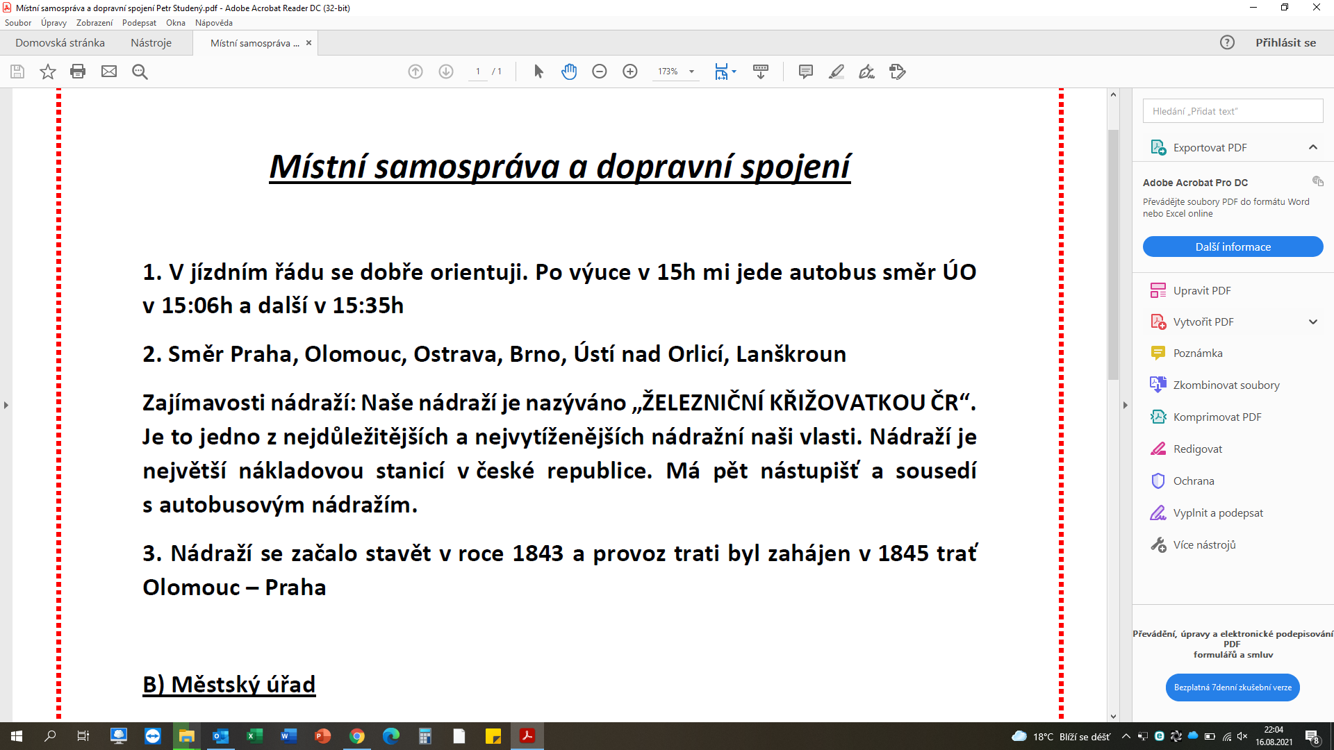 Navazující práce, tedy pátý úkol souvisel s oblastí „Dopravy a místní samosprávy“, na kterém žáci pracovali od února do června 2021.