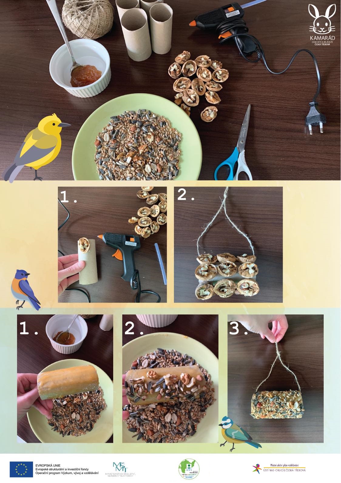 (můžeme použít i arašídové máslo), vlašské oříšky, ruličky od toaletního papíru, tavnou pistoli se silikonovou náplní, jutový nebo jiný provázek, prázdnou PET lahev, nůžky.