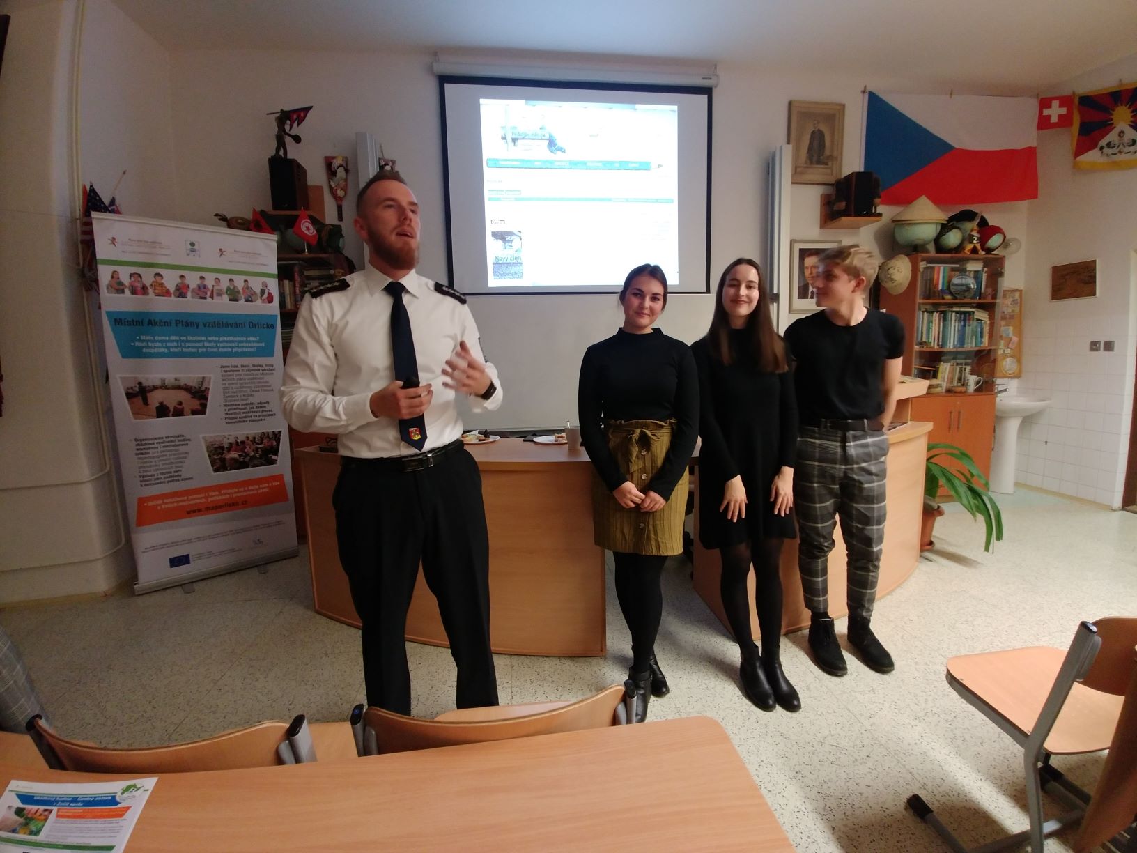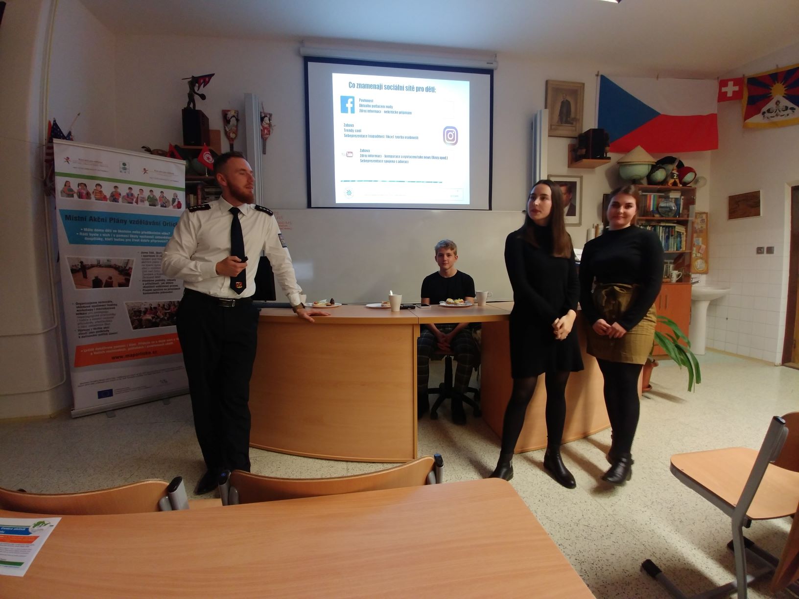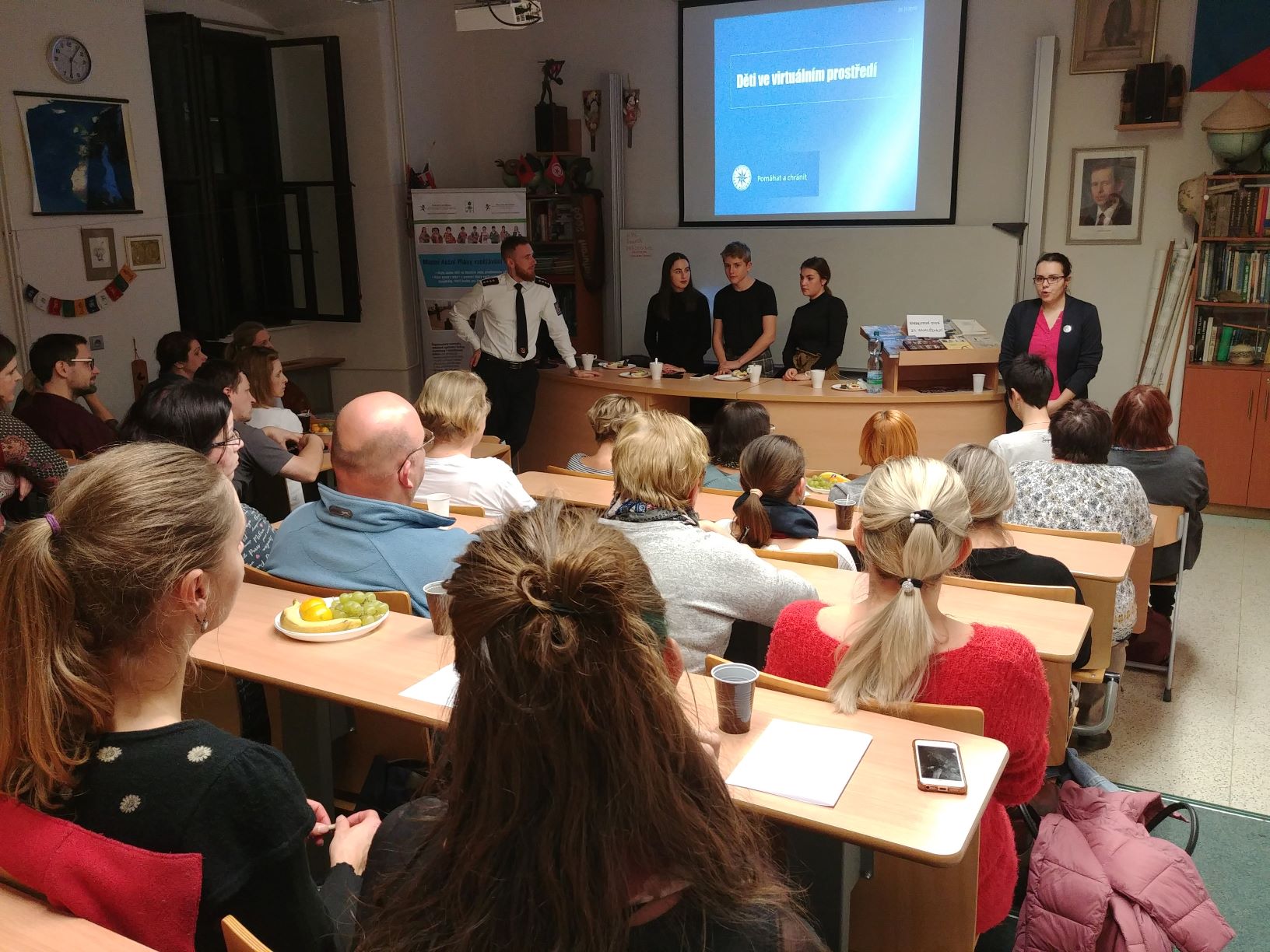 Kapitán Ondřej Moravčík rodičovské veřejnosti představil několik příkladů přímo z praxe, seznámil přítomné s metodami, které internetoví predátoři používají a mladí hosté (V. Plachetka, M. Vostrčilová a T. Cimmerová) účastníkům prezentovali pohled a přístup dnešní mládeže k sociálním sítím. Jsme rádi, že po ukončení prezentace proběhla mezi účastníky také diskuze k danému tématu. Z důvodu velkého zájmu rodičů stejný workshop zopakujeme i v květnu 2020.